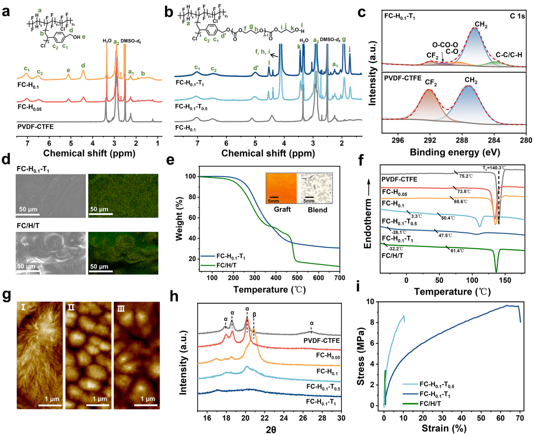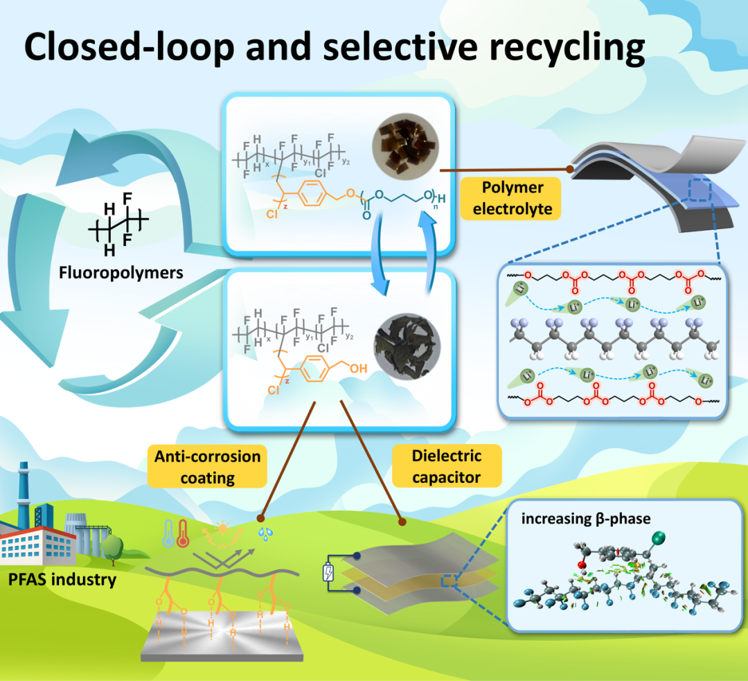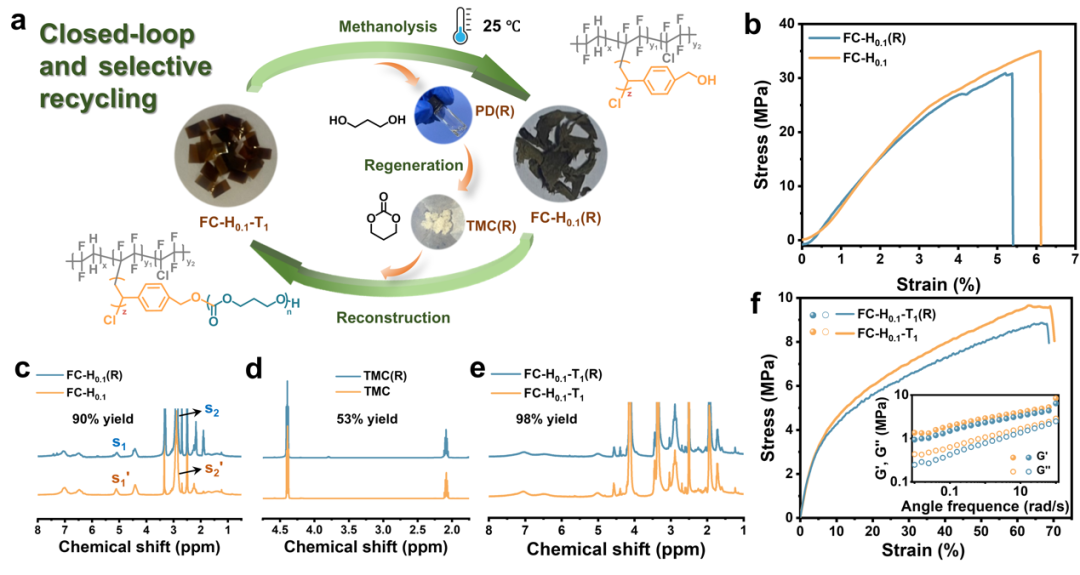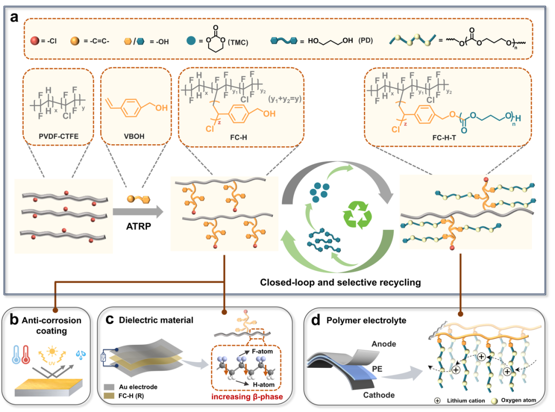 为解决含氟接枝共聚物的环境污染及回收困难问题,北京化工大学曹鹏飞教授/李崚湾副教授团队联合天津大学陈宇教授团队提出了一种选择性化学降解策略,降解共聚物材料中不含氟聚合物侧链,保留含氟聚合物主链,并将回收得到的含氟聚合物用于其他应用场景,以实现含氟聚合物材料的充分利用,解决PFAS材料难处理的问题。基于PVDF-CTFE主链,通过ATRP聚合改性和开环聚合接枝PTMC侧链合成接枝共聚物FC-H-T,产品可用于高性能聚合物电解质;在室温下借助廉价有机碱催化剂TBD将FC-H-T的PTMC侧链选择性醇解回收并完整保留得到FC-H主链及可再生TMC单体的二元醇。回收得到的FC-H主链可应用于介电材料、防腐涂层,且能够用于重新接枝再生的TMC单体并实现FC-H-T的重构;该工作展示了“选择性拆解-再生-重构”的闭环回收途径,兼顾材料性能与环保需求。