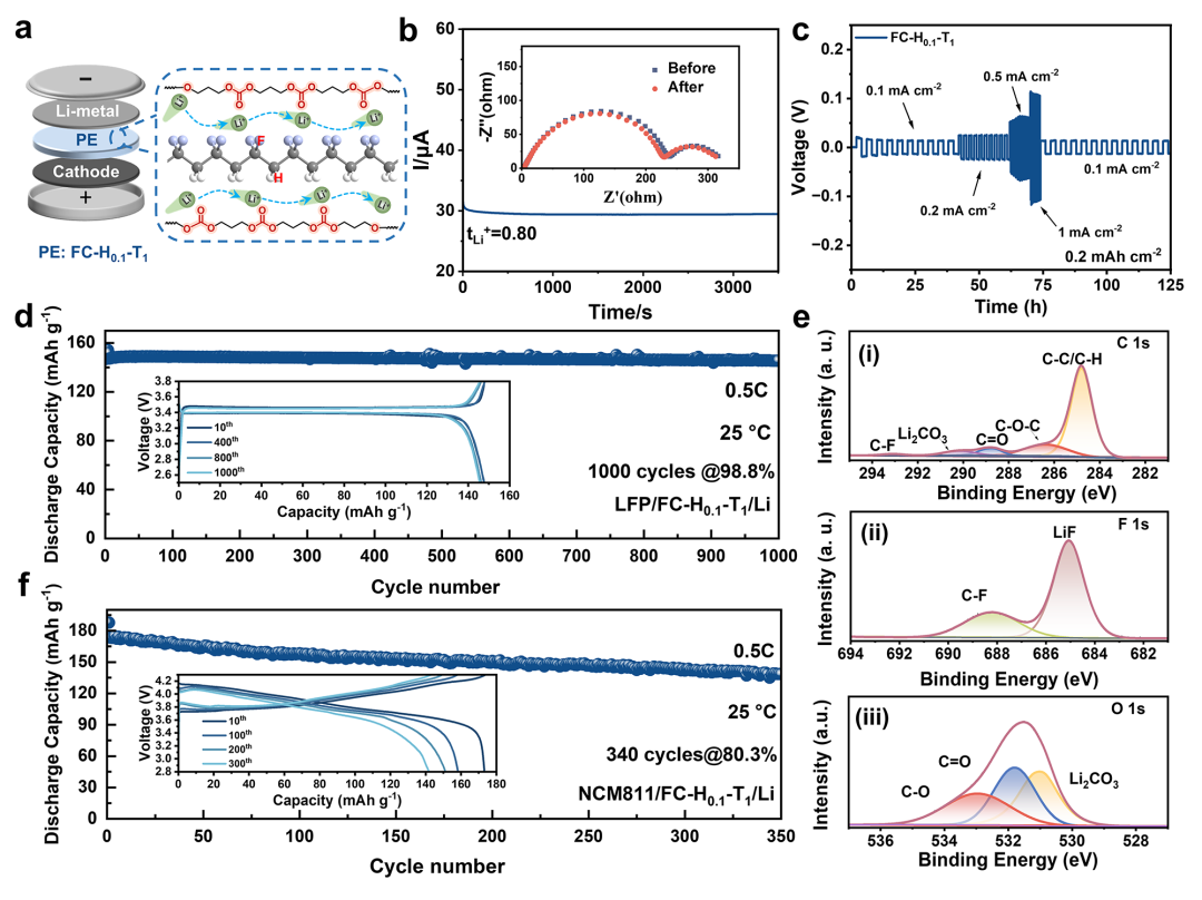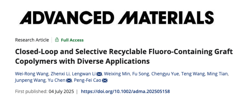 2025年7月4日,该研究以“Closed-Loop and Selective Recyclable Fluoro-containing Graft Copolymers with Diverse Applications”为题发表在《Advanced Materials》期刊,天津大学化学系博士生王玮榕为第一作者,北京化工大学曹鹏飞教授、李崚湾副教授与天津大学陈宇教授为共同通讯作者。北京化工大学田明教授、王腾教授,美国阿克伦大学(University of Akron)王军鹏教授等共同参与了研究工作。 “选择性拆解-再生-重构”的闭环回收策略 Scheme 1. PVDF-CTFE 接枝共聚物的闭环回收与应用示意图 【FC-H-T 接枝共聚物的合成】 FC-H-T接枝共聚物的合成主要分为两步:首先,利用原子转移自由基聚合(ATRP)技术,将4-乙烯基苯基甲醇(VBOH)修饰到主链PVDF-CTFE上,得到改性聚合物 FC-H (Scheme 1);然后,通过开环聚合将三亚甲基碳酸酯(TMC)单体接枝到FC-H,制得FC-H-T接枝共聚物。得到的FC-H-T各链段之间相容性、热稳定性、链段运动能力优于共混物FC/H/T。 图1. FC-H-T合成表征结果 【FC-H-T的电化学性能评估】 FC-H-T聚合物电解质在25 ℃时离子电导率为 6.3×10⁻⁴ S/cm,Li⁺迁移数为 0.8 (图2b),电化学稳定窗口达到4.4 V,与锂金属兼容性良好。在Li/Li对称电池中,0.5 mA/cm² 电流密度下可稳定循环超1000小时;LFP全电池0.5C循环1000次容量保持率 98.8%(图2d),NCM811高压电池340次循环后容量保持率80.3%(图2f),展现出优异的电化学性能。 图2. FC-H-T的电化学性能图 【FC-H-T的闭环回收】 图3. FC-H-T闭环选择性回收流程 【降解机理研究】 图4. 甲醇解对 FC-H-T 降解机制的研究 【回收聚合物的应用】 回收后的FC−H(R)聚合物可应用于静电电容器的电介质材料(图5a)以及防污涂层(图5b).D-E回线显示FC-H的放电能量密度显著高于初始PVDF-CTFE(0.45 vs. 0.17μC/cm2),这主要是由于PVBOH的-OH会与主链F形成氢键,诱导FC−H骨架β相增加及铁电畴尺寸减小(图5c-f)。OH单元赋予了FC-H功能性,回收膜展现出了对酸、碱、盐、紫外、高低温等恶劣环境的抗性(图5g-j)。此外,重构的FC-H-T(R)表现出了与初始FC-H-T相似的电化学性能。 图5. 闭环回收过程中各阶段产物的高价值应用研究