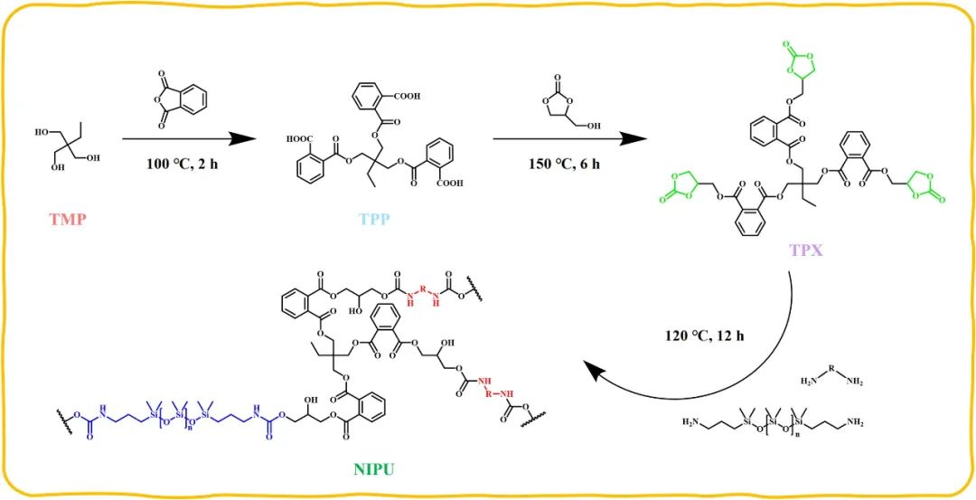 以三羟甲基丙烷(TMP)和甘油(GA)为原料,在常压下合成生物基五元环状碳酸酯,然后通过环状碳酸酯与多胺反应制得NIPU。 该NIPU具有优异的机械性能和热稳定性,拉伸强度高达31.05MPa,杨氏模量为406MPa。该NIPU还具有良好的自修复性能,在120℃下加热12小时后自修复效率可达90%。该NIPU还具有优异的粘附性能和高达4.02MPa的剪切强度。此外,长链二胺显著增强了NIPU4的疏水性,NIPU4涂层的水接触角提高到112.65°。因此,本研究不仅实现了常压下NIPU的绿色、高效制备,而且在保证良好机械性能和耐热性的基础上,克服了疏水性和耐水性差的缺点,为生物基NIPU的设计和开发提供了研究思路,扩大了其在建材、家具、电子器件等行业的应用。 NIPU制备流程图 NIPU制备流程图。