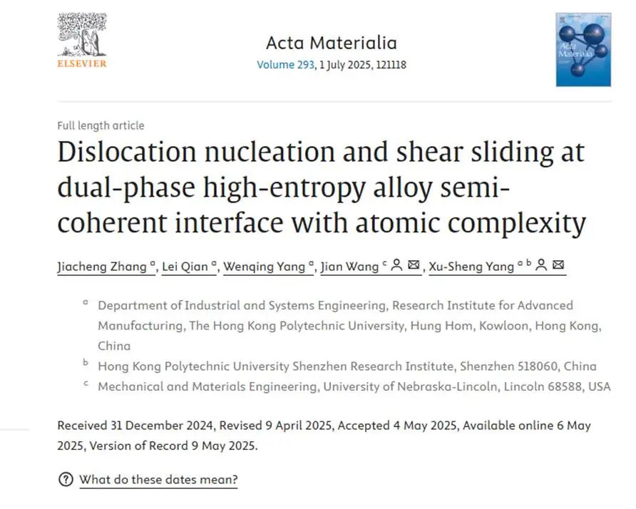 有关此课题,香港理工大学的学者们进行了深入研究相关研究报告以“Dislocation nucleation and shear sliding at dual-phase high-entropy alloy semi-coherent interface with atomic complexity”发表在Acta Materialia上