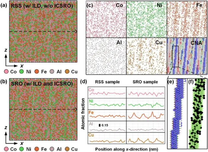 图2.界面原子构型。(一、二)RSS 和 SRO 样品界面平面的面内原子结构。(c) SRO 样品界面处不同原子类型的空间排列。界面的原子构型是从 bcc 一侧看到的,原子通过共同邻分析(CNA)方法着色:fcc 结构为绿色,bcc 为蓝色,hcp 为红色,其他结构为白色。(d)(a, b)中虚线箭头指示的单元沿 x 方向的分布。(e) bcc 站点及其周围环境的放大视图;为清楚起见,省略了其他原子。(f)与(e)中的相同位点,其中 Fe 原子为黑色,所有其他原子为绿色以突出偏析。