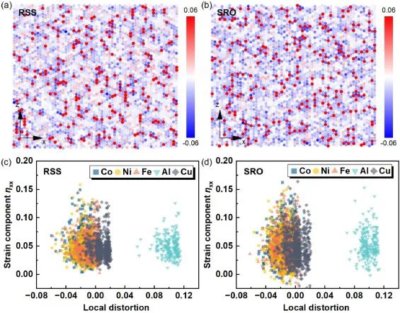 图10.(a) RSS 和(b) SRO 样品中原子由局部畸变参数着色的界面原子构型。(c)RSS 和(d) SRO 界面的原子应变分量和局部畸变参数χ的元素分辨相关性。