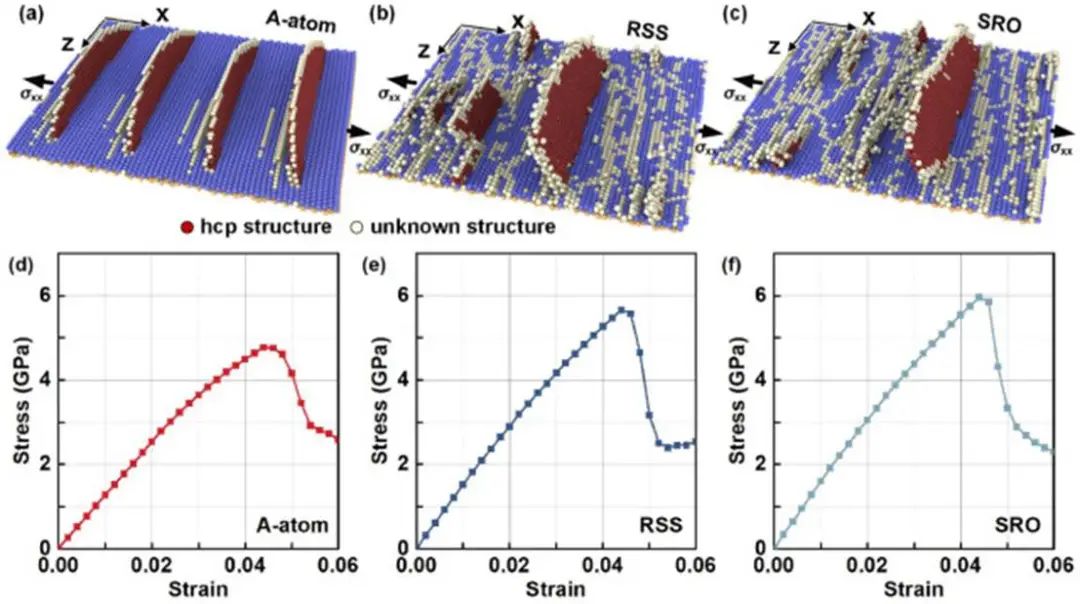 图8.沿 x 轴拉伸作用下(a) A 原子、(b) RSS 和(c) SRO 界面处的部分位错成核特性。透视在 x-z 平面中移动以获得更好的视图。原子根据 CNA 方法进行着色,红色代表 fcc 中的 hcp 结构,白色代表未知(无序)结构,蓝色代表 fcc 中的有序结构,橙色代表 bcc 中的有序结构。相应的应力-应变曲线如