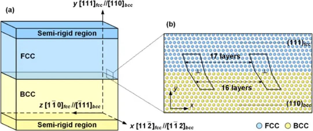 图1.双层模型的描述。(a) fcc/bcc 双层的 MD 仿真模型。(b)具有 KS 方向关系的 fcc/bcc 界面的放大侧向视图,显示失配位错。