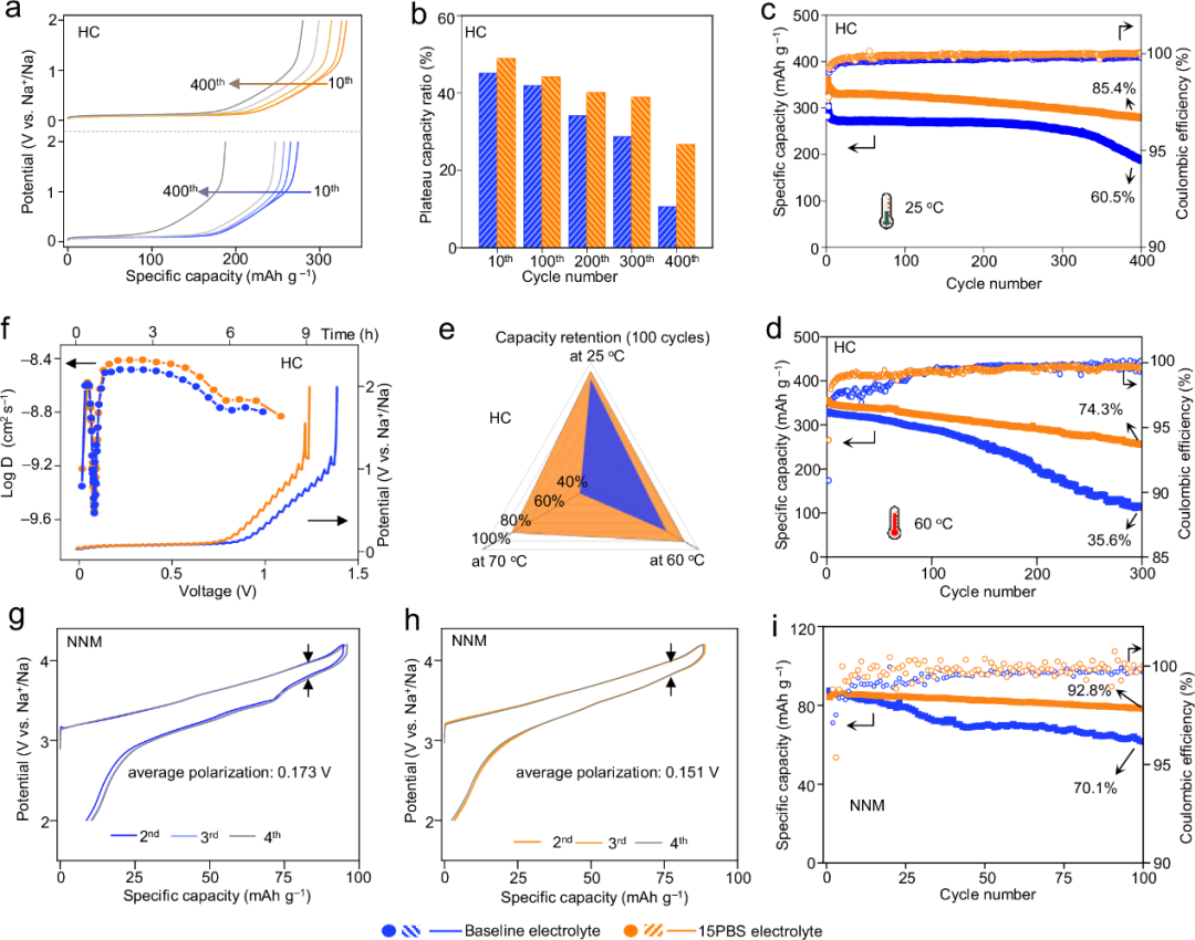郑州大学陈卫华、北京化工大学张志国等研究者设计了一种锁链型添加剂——4,4'-(1,4-亚苯基双(氧基))-双(丁烷-1-磺酸钠)-15-冠醚-5(ISPBS),实现了从体相到界面的电解液优化。在电解液相中,ISPBS的亲水性磺酸基团(-SO₃⁻)和15-冠醚-5通过吸附将活性聚集态水(强氢键)转化为非活性水(弱氢键),有效抑制水分诱导的电解液分解。在电极界面,ISPBS优先吸附于硬碳表面,置换双电层(EDL)内的溶剂,形成富含苯基的硫化物SEI,加速Na⁺传输;同时在Na₀.₇₂Ni₀.₃₂Mn₀.₆₈O₂(NNM)正极构建稳定阴极电解质界面(CEI),改善Na⁺迁移动力学。基于ISPBS电解液的HC||NNM全电池在500 mA g⁻¹下循环2000次,基于活性物质总质量的高比能量达191.7 Wh kg⁻¹。此外,ISPBS可兼容锂离子电池酯基电解液,提升石墨/Si-C负极循环稳定性。