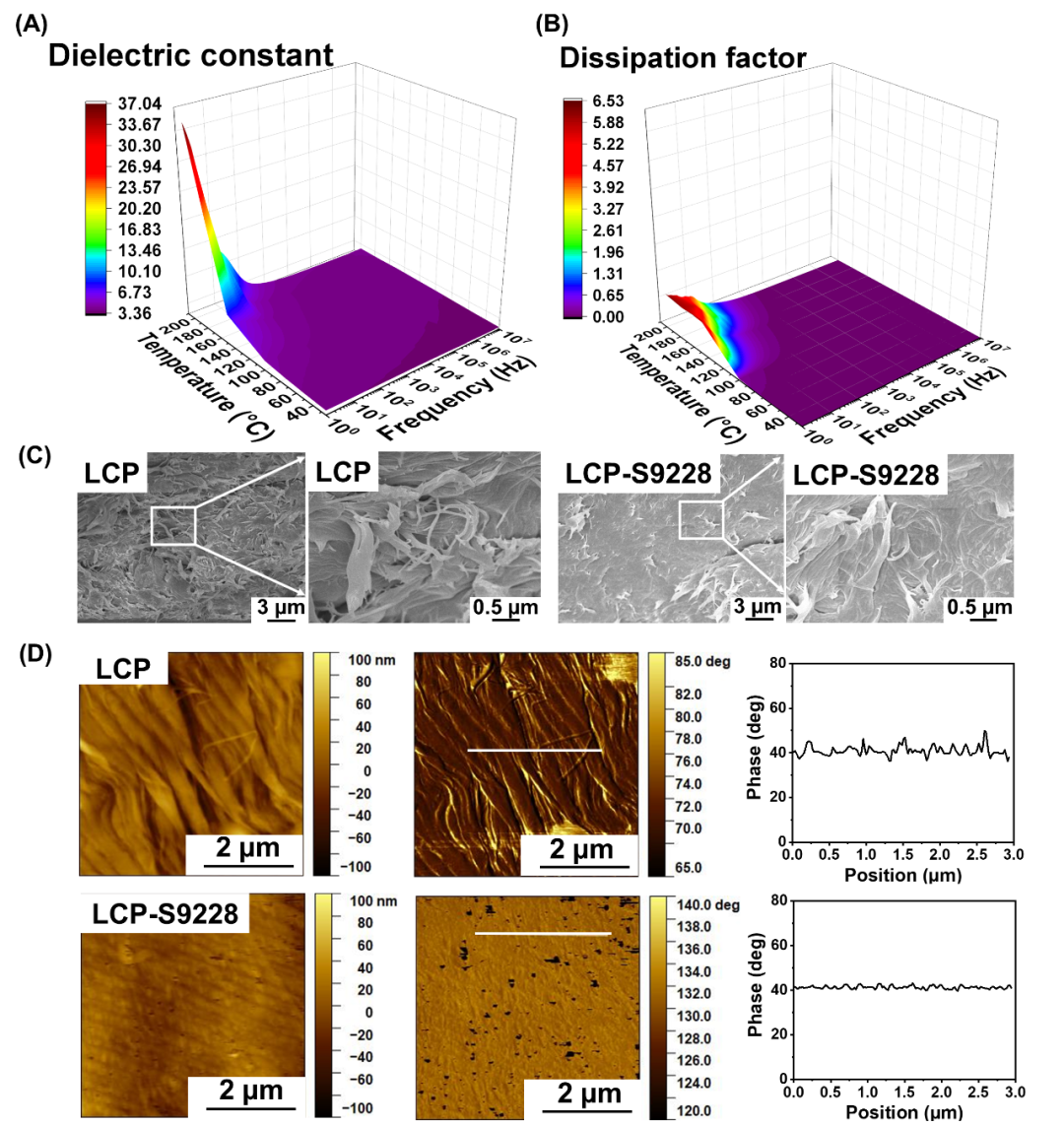 图3 LCP的介电性能和表面微观形貌