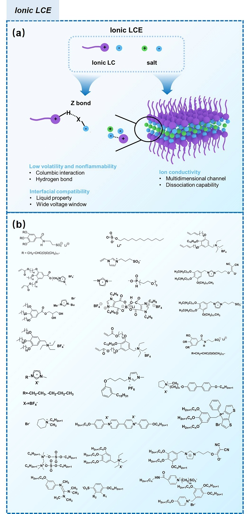 离子型液晶(LCEs)的特点是存在离子液晶分子,这些分子包含阳离子、阴离子和双离子功能团。这些离子物种不仅赋予材料导电性,还通过自组装过程促进纳米级离子通道的形成,这对于有效的离子传输至关重要。离子型液晶的分子结构设计旨在促进离子物种的排列和相互作用,从而增强其传导锂离子的能力。功能基团如咪唑鎓、铵和膦鎓在离子型液晶的设计中起着关键作用。这些基团被战略性地整合到液晶框架中,以创建有利于离子传输的静电环境。这些离子部分的存在允许建立强烈的离子-偶极相互作用,导致在液晶基质内形成结构化的离子路径。这些路径促进了1D和2D离子传输,这对于提高高性能LIB所需的离子导电性至关重要。离子型液晶的独特自组装行为使其能够形成有序的介相,如柱状、层状或立方相,这些相有利于离子迁移。自组装过程产生的离子通道的纳米尺度尺寸增强了锂离子的有效扩散,从而降低了与离子传输相关的能量障碍。因此,离子型液晶表现出优异的电化学性能,使其成为未来先进储能系统电解质配方的有吸引力的选择。图9a强调了离子液体(ILs)和离子型液晶在能源存储和转换系统中的优势,着重于它们的基本性质和界面行为。离子液体的一个关键特征是其固有的低挥发性和不可燃性,这可以归因于其分子结构中存在的独特之字形(Z)键。这种Z键通过阳离子和阴离子之间的库仑相互作用和氢键形成。由此产生的键以其高能量、长寿命和独特的Z模式为特征,共同贡献于离子液体的热稳定性、低挥发性和防火性能。这些特性满足了对更安全、环保的能源相关应用材料日益增长的需求。
