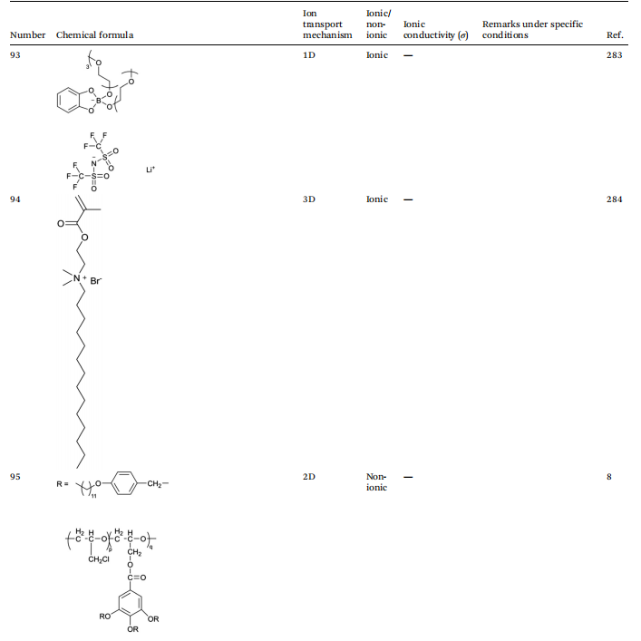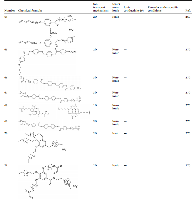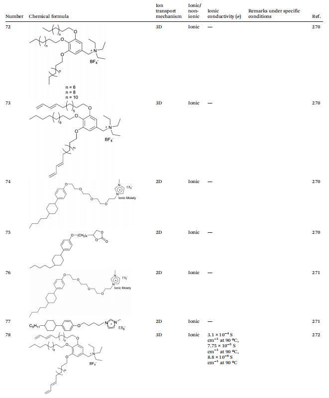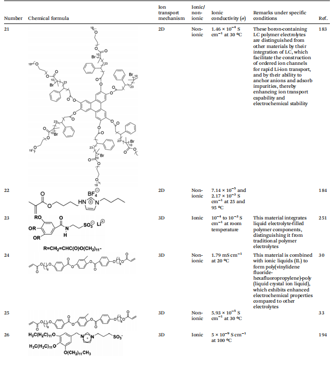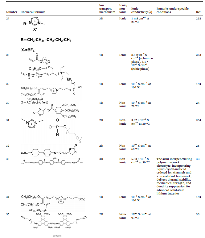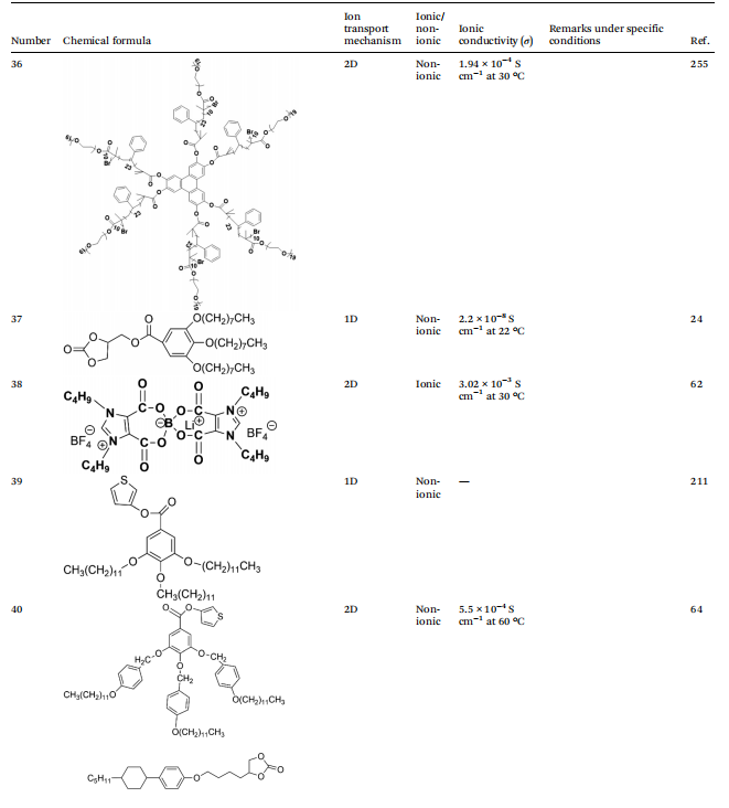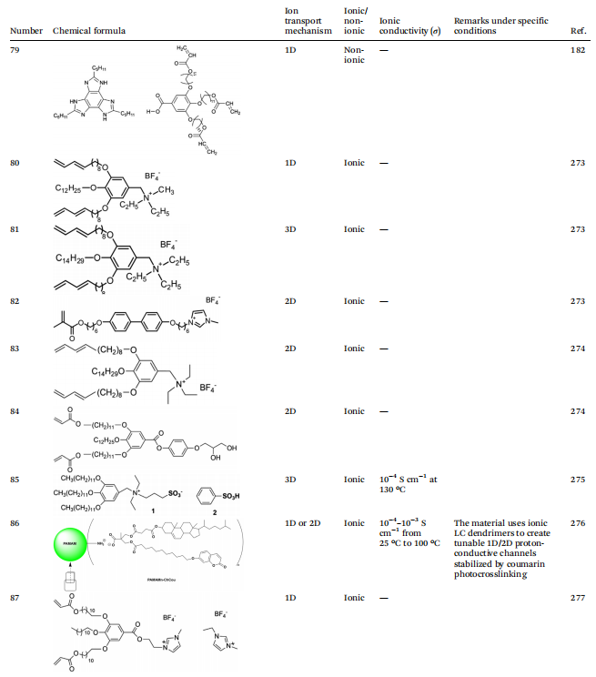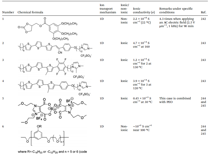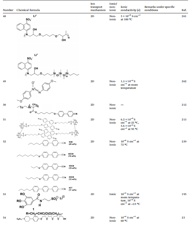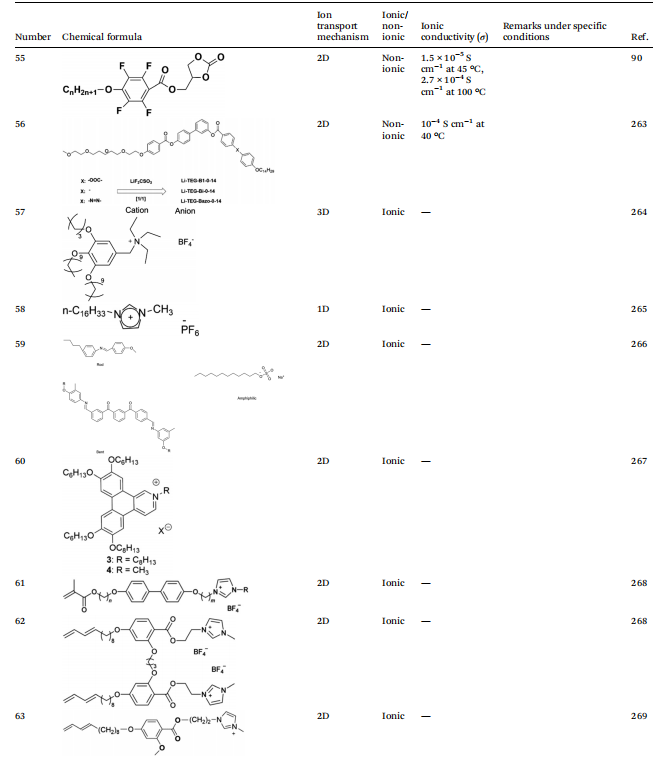 根据液晶电解质中离子传导的机制,可以进一步将其分为三种不同的类型:首先,由自组装形成的1D传输通道,提供线性路径使锂离子通过其一维排列移动;其次,二维传输通道,允许锂离子在二维平面上更灵活地迁移;第三,三维传输通道,构建了一个复杂的三维空间网络,有效提高了锂离子的传输效率。这些不同的离子传导机制不仅影响了离子迁移的动力学,也直接影响了锂电池的整体性能。这一理解既作为理论基础,又作为实际指导,优化液晶电解质在电化学储能设备中的应用。因此,系统地分类液晶电解质的离子传导机制对于理解其传导机制以及设计具有优异性能特性的液晶分子至关重要。