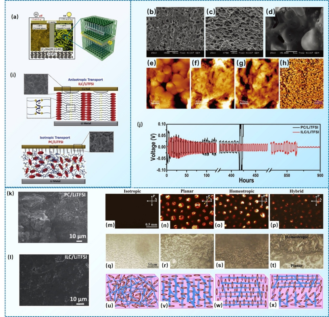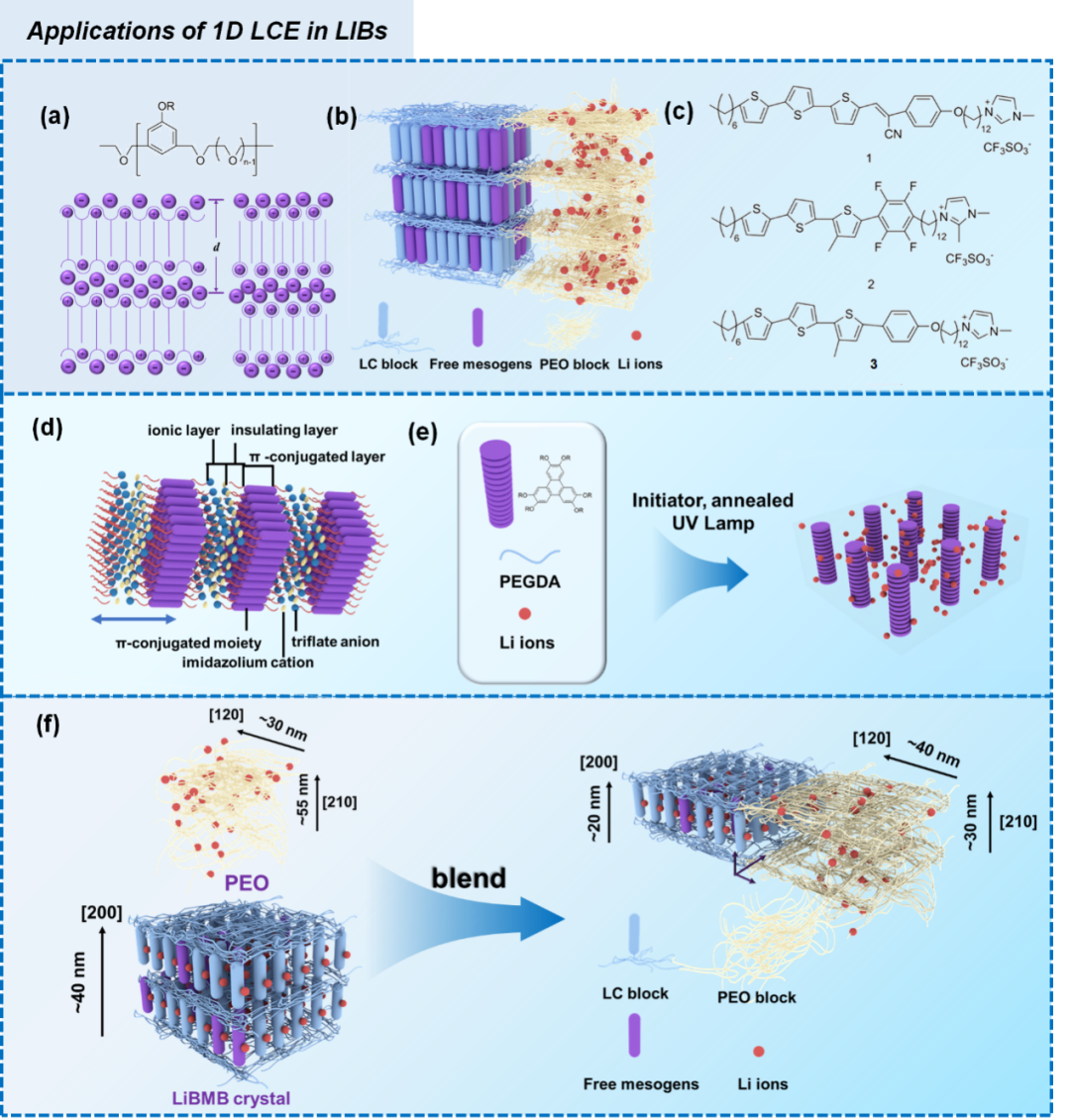 液晶(LC)凭借其独特的各向异性特性,赋予液晶电解质(LCE)在锂离子传输方面独特的机制。具体来说,LCE的自组装行为导致了柱状、层状和双连续立方相等纳米结构的形成,这些结构提供了高度有序的通道以促进锂离子传导。这种有序性源于液晶分子的高度组织的空间排列,促进了纳米多孔通道的形成,显著提高了锂离子的传输速率和稳定性,在塑造锂电池的电化学性能中起着关键作用。