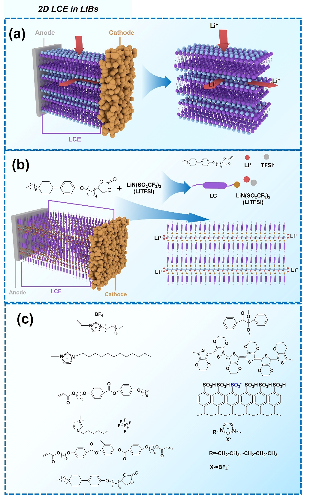 图5 (a)二维LCE在LIBs中的机制示意图。(b) 液晶化合物和锂盐的分子结构,以及相应的二维LCE在LIBs中的示意图。(c) 引用的二维LCE工作中使用的分子结构。