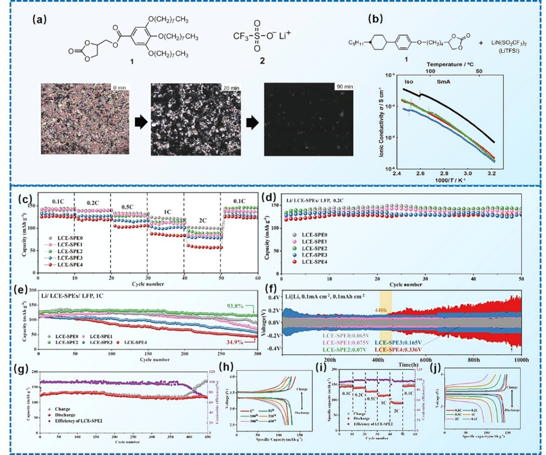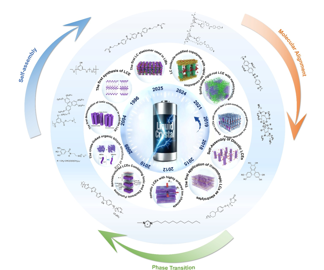 在全球向清洁能源与可持续未来加速转型的背景下,开发兼具卓越能量密度、本质安全性和超长循环寿命的先进电化学储能技术变得至关重要。锂离子电池(LIB)作为当前储能体系的主导技术平台,凭借其出色的能量密度与转换效率,已在消费电子至交通电气化等广泛领域确立了核心地位。然而,其普遍采用的液态电解质体系所固有的热失控风险及电化学性能瓶颈,日益凸显出对创新性电解质解决方案的迫切需求。在此背景下,液晶电解质(LCE)作为一种极具潜力的前沿电解质体系,因其独特的自组装特性和分子有序性,展现出解决传统液态电解质关键安全缺陷与性能局限性的巨大前景。