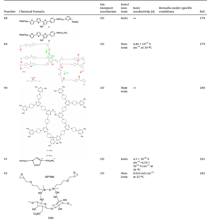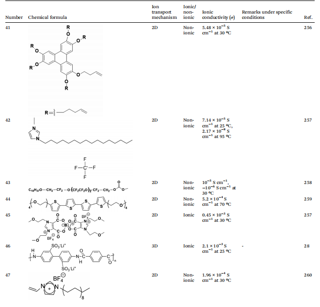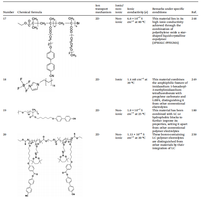 根据液晶(LC)成分的分子结构对LCEs进行分类,对于阐明其离子传输机制和优化其在电化学应用中的性能,特别是锂离子电池(LIBs),至关重要。这种分类划分为两大主要类别:离子型LCEs和非离子型LCEs,每种类型表现出不同的性质和行为,影响它们作为电解质的实用性。将LCEs分类为离子型和非离子型提供了对其设计和功能作为电解质的重要见解。每个类别都提供了独特的优点,可以利用这些优点来增强离子传输机制,使其成为追求更高效、高性能储能系统的关键材料。理解这些区别不仅有助于开发先进的LC电解质,还为电化学领域的研究和创新开辟了新的途径。