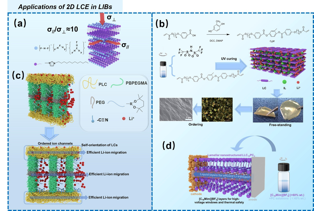 因此,本综述从多个关键角度对液晶电解质进行了全面分析:首先,探讨LCE的基本概念、分类、结构特征及离子传导机制;其次,分析LCE在LIBs中的具体应用,重点关注其对提升电池性能、延长循环寿命和提高安全性的贡献;最后,展望LCE在LIB技术中的未来发展趋势,包括潜在挑战和新兴机遇。这种全面分析为液晶电解质的深入研究提供了宝贵见解,从而推动新型电池材料的创新与应用。