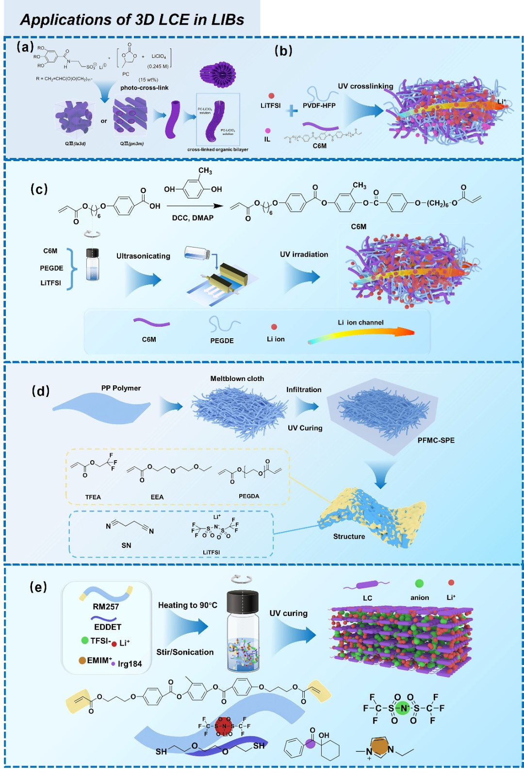 图7 (a)基于分子1形成的双连续立方相交联与PC-LiClO4溶液制备的锂离子导电固液纳米复合材料。(b) LC-IL固态聚合物电解质的合成路线。(c) 使用C6M LC、PEGDE和LiTFSI具有定向网络结构的半互穿网络电解质制备过程。(d) PFMC-SPE的制造工艺。(e) LCEs制造过程示意图。