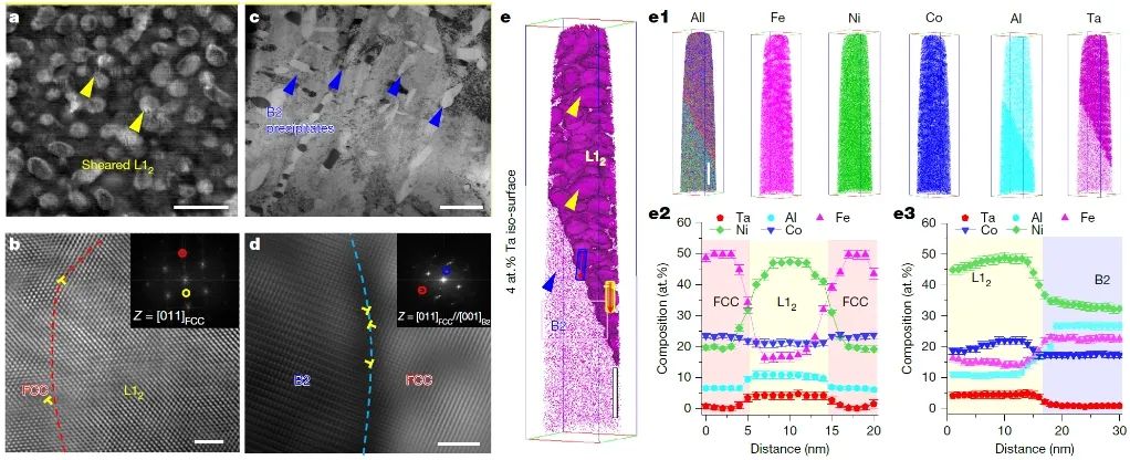 图2. (a-d) 具有三相组织的Fe35Ni29Co21Al12Ta3复杂合金室温变形与界面特征,即位错能够切过L12纳米相,并存储于低模量的B2微米相,L12/FCC共格与B2/FCC非共格界面均存在位错;(e)原子探针分析复杂合金的化学成分与分布特征,以及多主元L12纳米相和B2微米相的元素构成。