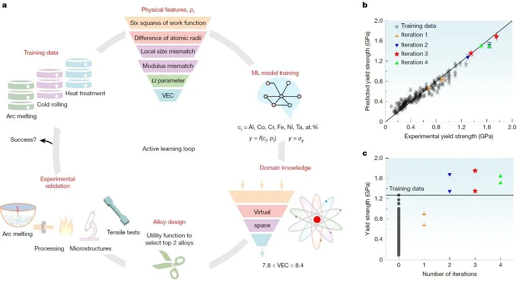 图1. (a)基于领域知识的机器学习模型(主动学习循环由六个步骤组成)预测具有超强塑性的FeNiCoAlTa复杂合金,(b)理论预测屈服强度与实验测量屈服强度相符合,证实了机器学习模型的可靠性,(c)实验测量屈服强度与模型迭代次数的关系,发现了最优成分的Fe35Ni29Co21Al12Ta3复杂合金。