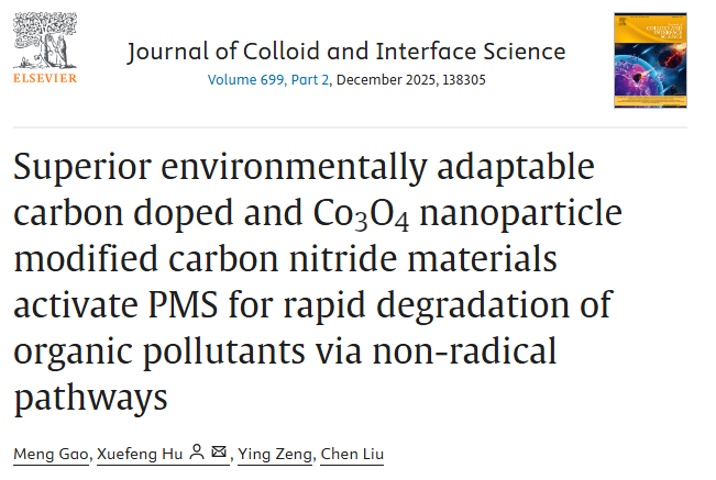 Meng Gao, Xuefeng Hu, Ying Zeng, Chen Liu, Superior environmentally adaptable carbon doped and Co3O4 nanoparticle modified carbon nitride materials activate PMS for rapid degradation of organic pollutants via non-radical pathways, Journal of Colloid and Interface Science, 2025, https://doi.org/10.1016/j.jcis.2025.138305
