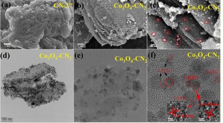 Fig. 2(a) the SEM of CN-2″, (b), (c) the SEM of Co3O4-CN2, (d), (e) and (f) the TEM of Co3O4-CN2.