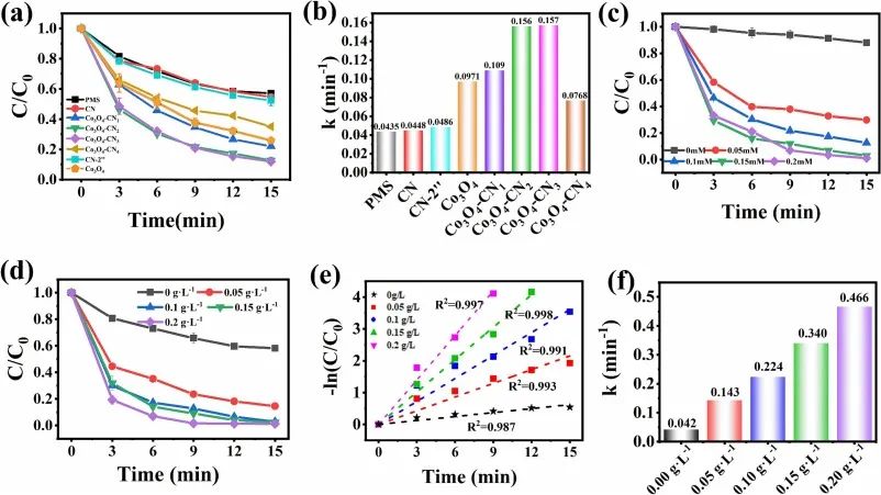 Fig. 4(a) Degradation of OTC by different materials (cat. = 0.1 g·L−1, PMS = 0.1 mM, OTC = 20 mg·L−1) and (b) the corresponding first-order kinetic constants, (c) different concentrations of PMS, (d) different catalyst concentrations and the corresponding, (e) first-order kinetic fitting, (f) first-order kinetic constants.