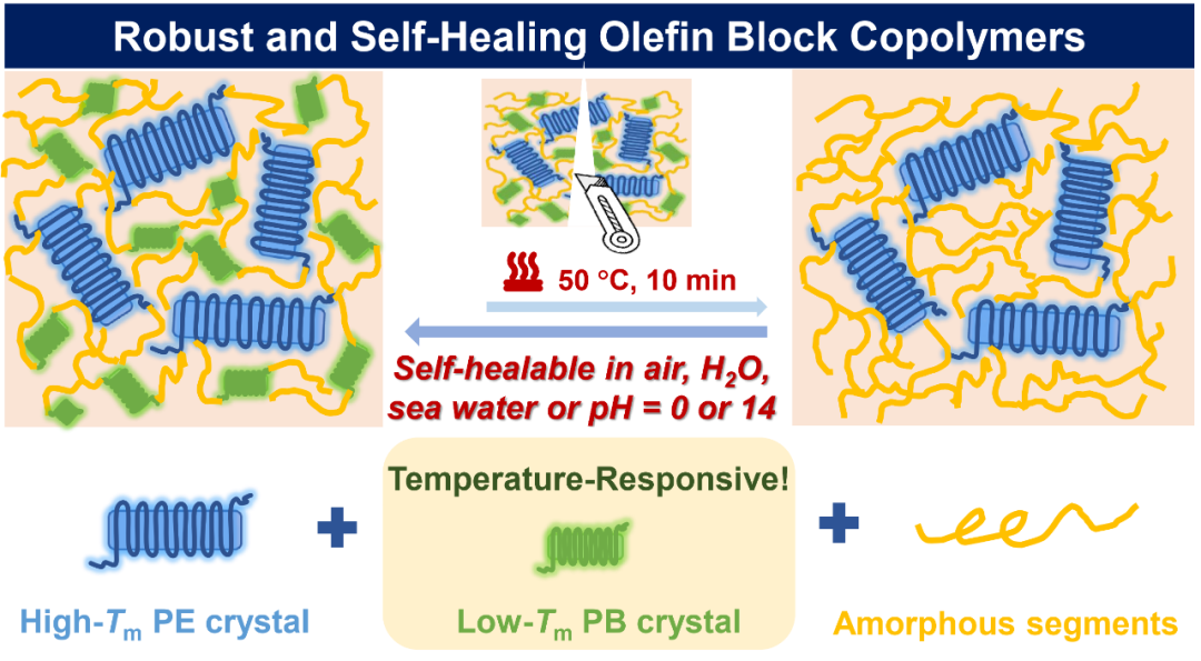 聚乙烯、聚丙烯、聚丁烯等聚烯烃材料应用范围广泛,以低成本、易加工、高阻隔性和耐用性著称,占据合成高分子材料的一半以上。由于聚烯烃材料缺乏极性官能团,又具有较高的熔点,在保持其高阻隔性、高耐热性等性能的前提下,赋予传统聚烯烃自修复能力一直是极具挑战性的课题。近期,天津大学材料科学与工程学院潘莉教授团队在《Macromolecules》发表题为“Intelligent Self-Healing Design of Conventional Polyolefin Materials”的研究论文,提出了一种创新的“三相协同仿生设计”策略,成功实现了兼具高熔点、高强度与高效自修复性能的完全非极性的烯烃嵌段共聚物(OBCs)的可控制备。这项创新设计不仅突破了传统非极性聚烯烃材料刚性-柔性不可兼得的局限,更在高盐、强酸、强碱等恶劣环境耐受性方面展现出无可比拟的优势(图1)。文章的第一作者是天津大学材料学院博士生蔡浩,潘莉教授为通讯作者。