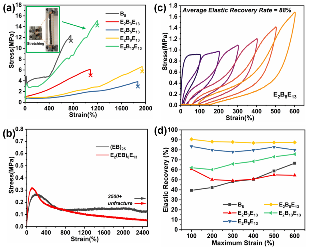 通过系统调控PB嵌段长度(E2B3E13至E2B13E13系列),材料表现出可编程的力学行为(图3):