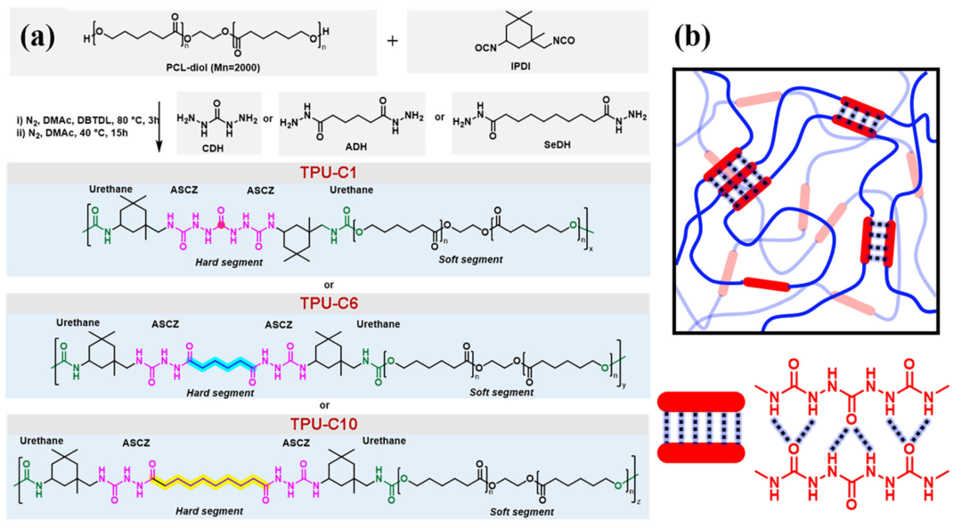 研究以PCL二醇、异佛尔酮二异氰酸酯(IPDI)及六种同系二酰肼(C1DH至C10DH)为原料,通过两步法合成TPU。ASCZ基团由酰胺和脲基组成,可形成三重氢键阵列(图1b),构建强相互作用的硬段(HS)网络。所有样品硬段含量固定为24 wt%,仅通过改变二酰肼亚甲基间隔基长度调控氢键密度。