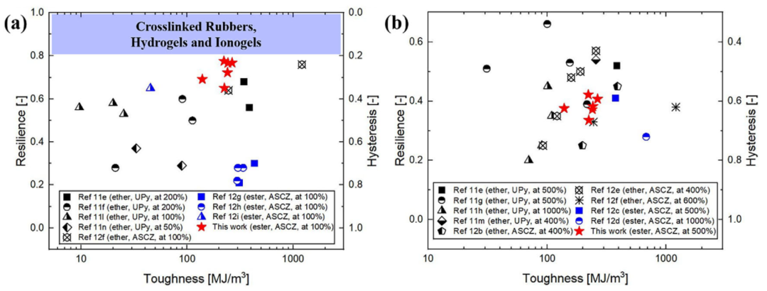 图4 TPU-C1至TPU-C10与含多齿氢键硬段的文献报道TPU的回弹性-韧性Ashby图: a) 低应变区(50–200%); b) 高应变区(400–1000%)。括号内标注参考文献编号、软段/硬段化学组成及回弹性测试应变值。图a中0.8–1回弹性区间仅见于交联橡胶、水凝胶和离子凝胶。