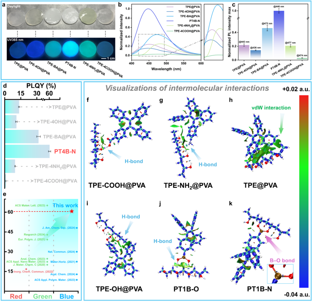 近期,福州大学功能高分子工程技术研究所林腾飞副教授团队联合福州大学附属省立医院麻醉医学中心郑晓春教授团队,受海洋生物行为的启发,设计了一种基于共价交联实现高效荧光的仿生软体致动器(图1)。致动器由双层水凝胶构成:发光层PT4B-N通过冻融法形成,其中TPE-4BA与聚乙烯醇(PVA)发生共价交联;驱动层PNPC采用光引发聚合法形成,主要成分包括PT4B-N和聚丙烯酸(PAAc)。值得注意的是,发光层以共价交联结合荧光分子,实现了高光致发光量子产率(PLQY > 60%)。作者构建了不同类型的四苯乙烯(TPE)分子模型用以进一步分析,结合密度泛函理论(DFT)计算和相互作用区域指示函数(IRI),揭示了其高亮度荧光现象源自于分子内旋转与振动受限效应,这一结果在实际中得到了验证(图2,图3)。
