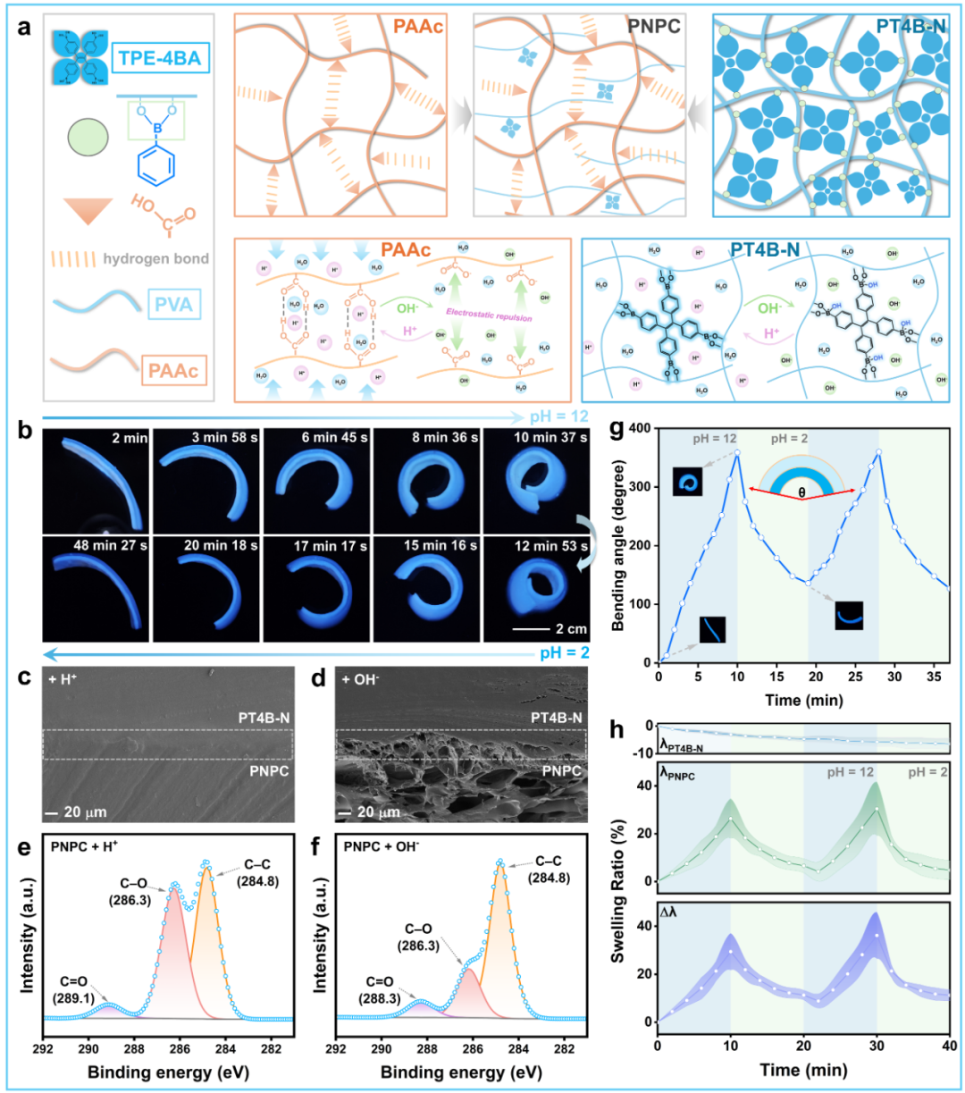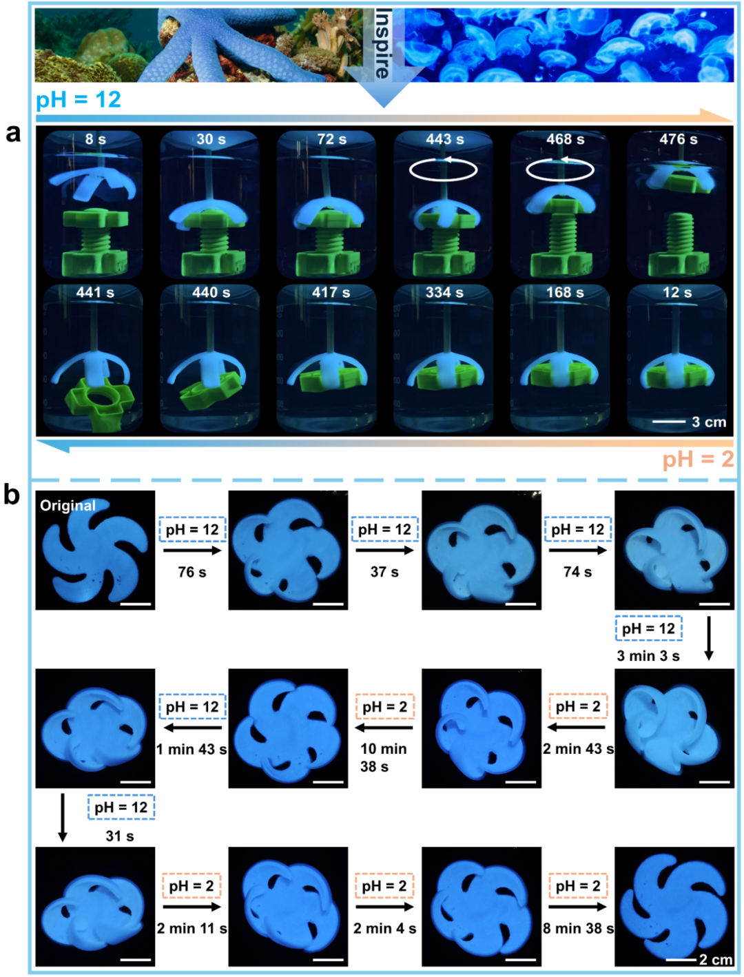 由于驱动层中的PAAc在不同pH条件下表现出的溶胀特性(图4),借助双层水凝胶间的溶胀差异,致动器可以实现运动控制(条状水凝胶:最大弯曲角度 ≈ 360°,循环时间≈ 20 min)。双层水凝胶无需界面粘合剂即可实现层间稳定结合,简化了制造工艺。实验结果表明,该器件可以执行抓取、释放等类似生物的协同荧光和形状变化行为(图5),在长时间工作和海水环境下依然能够维持高亮度荧光性能。