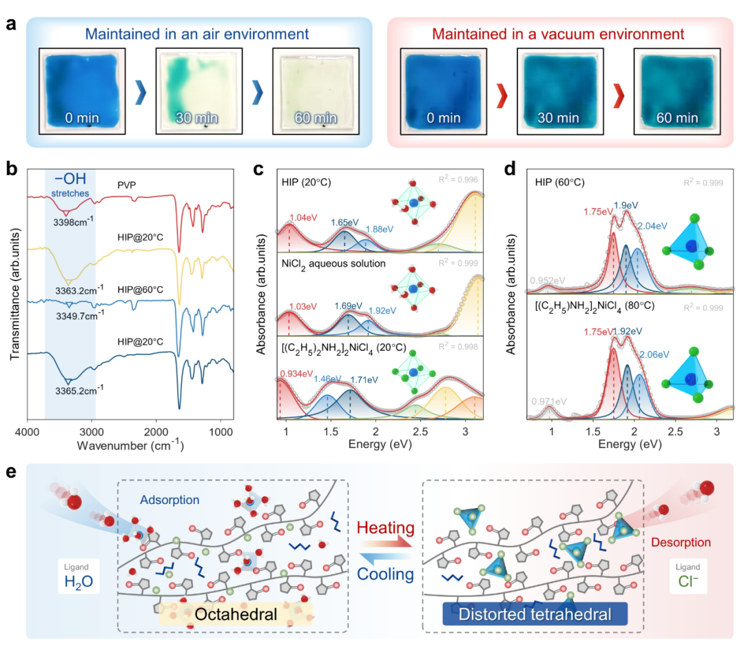 (2)机制揭示:结合原位变温谱学分析、电子-磁性表征与热响应行为测试等多维手段,系统解析了HIP热致变色过程中Ni2+配位构型在水合/脱水状态下的动态重构机制,明确了结构转变与光学响应之间的因果联系。