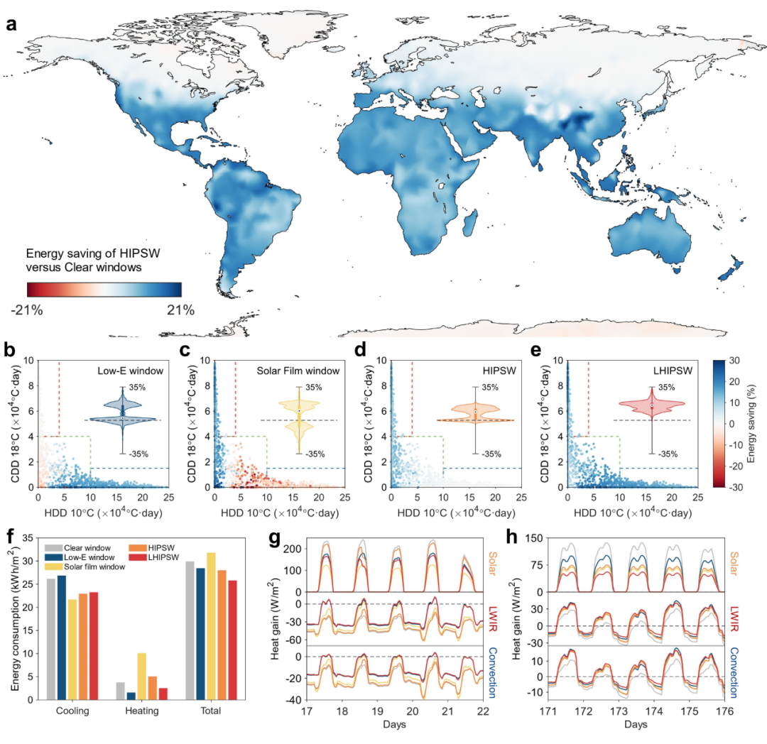 为进一步评估HIPSW的节能潜力,研究基于EnergyPlus对10层办公建筑进行了全年能耗模拟。结果显示,HIPSW在全球范围内最高可实现21%的能耗降低,尤其在中纬度和湿热气候区表现出稳定的节能优势。通过对1623个城市的HDD/CDD气候分类分析发现,相比Solar film在热带地区的局部优越性与Low-E玻璃在寒带的加热负荷削减效果,HIPSW在大多数区域均表现出温和而均衡的节能效应,其最概然节能率为11.4%。进一步将HIPSW与Low-E玻璃复合构建LHIPSW后,在暖寒地区节能率提升至17.7%。以北京为代表分析不同窗型节能机制发现,HIPSW兼顾降冷负荷与控热损的能力,而LHIPSW进一步实现夏季抑制太阳辐射与冬季增强长波保温的协同,优化全年负荷匹配。此外,HIPSW在大尺寸制备、成本控制及生物安全性方面也展现出良好前景,进一步验证了其在建筑节能领域的广泛适用性与工程化潜力。