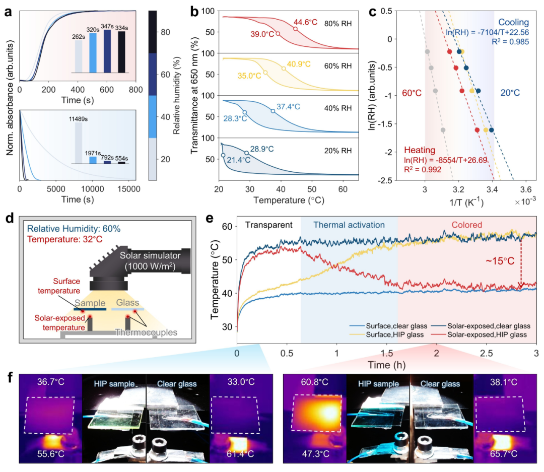 图3 HIP热致变色薄膜的湿度调控转变行为与模拟阳光下的热响应性能