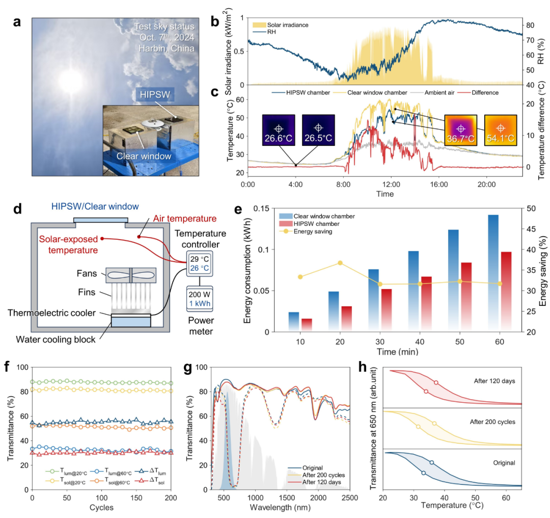 (3)测试评估:通过实地测试与建筑能耗模拟,验证了HIP智能窗(HIPSW)在自然环境下可实现自发激活,动态调控太阳热输入,展现出其在绿色建筑中的广泛应用前景。