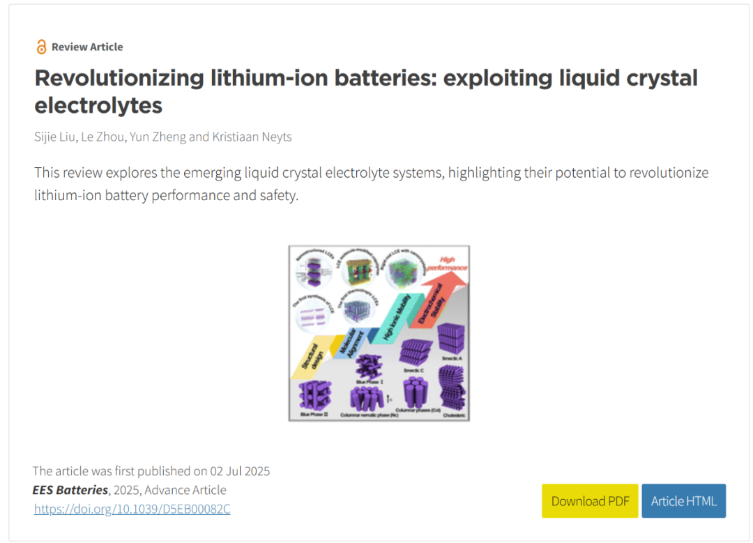 论文信息: Revolutionizing Lithium-Ion Batteries: Exploiting Liquid Crystal Electrolytes Sijie Liu†,* Le Zhou†, Yun Zheng,* Kristiaan Neyts* EES Batteries, 2025, Advance Article 论文链接: https://doi.org/10.1039/D5EB00082C