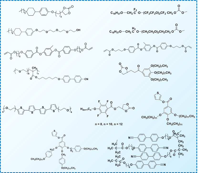 图5 (a)二维LCE在LIBs中的机制示意图。(b) 液晶化合物和锂盐的分子结构,以及相应的二维LCE在LIBs中的示意图。(c) 引用的二维LCE工作中使用的分子结构。