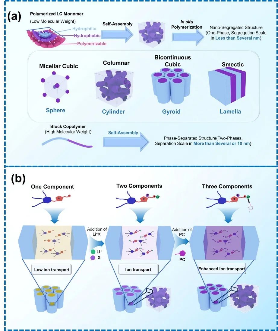 图13 (a) LCEs自组装纳米结构在锂电中的应用。(b) 提升锂离子传输的纳米结构LC材料策略示意图。