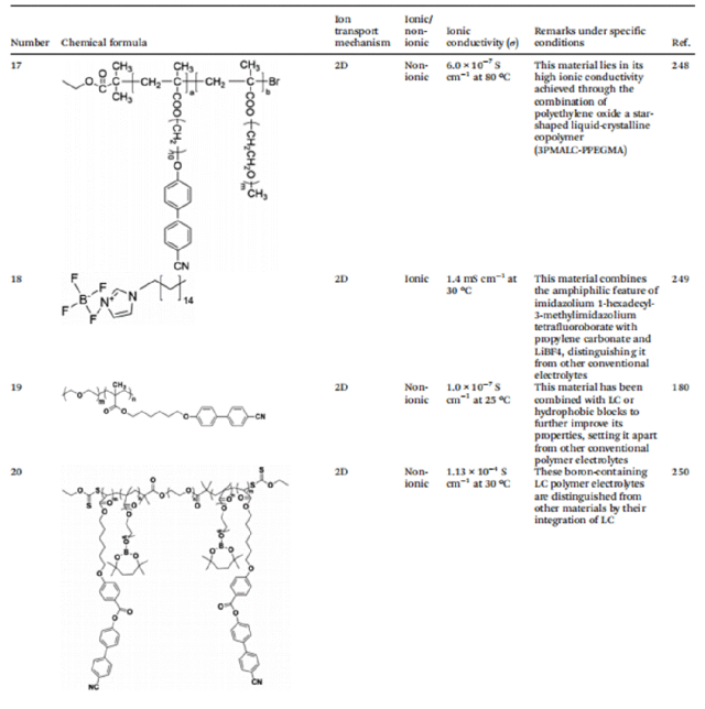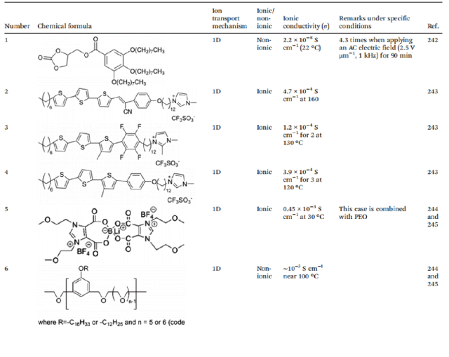 图1 液晶电解质(LCE)发展史上的几个关键点。首次合成液晶电解质。首次在类似固体的液晶电解质中展示离子传导。液晶电解质的交联有机双层结构。结合离子和电子功能的纳米结构液晶电解质。具有高度有序离子通道的向列型液晶电解质。首次将热致液晶用作电解质。盘状液晶电解质的自组装。首次将热致液晶用于锂离子电池。用于固态电池的具有有序快速锂离子传导纳米通道的柔性液晶电解质。具有纳米晶的固态刚性棒液晶电解质。快速离子传导的液晶分子改性共聚物。首次用于锂离子电池的液晶电解质。