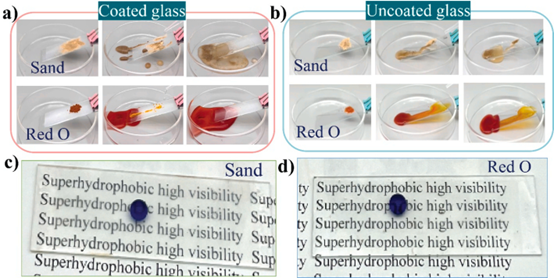 (a-b)涂覆TESH涂层玻璃(a)和未涂覆涂层玻璃(b)的自清洁性能;(c-d)清洁试验后TESH涂层玻璃上水滴的光学照片。