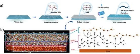 首先通过构建硅烷化三甲基硅烷(TMS-s)/聚二甲基硅氧烷(PDMS)促进剂层,然后通过静电纺丝技术将聚偏二氟乙烯-三氟乙烯(PVDF-TrFE)/聚二甲基硅氧烷(PDMS)混合纳米纤维整合到TMS-s/PDMS促进剂层上,涂覆在玻璃基材上获得多功能涂层。