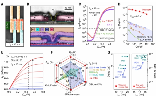 北京大学刘开辉教授团队开发了一种固-液-固(SLS)生长策略,成功制备出5厘米(2英寸)晶圆级高质量二维硒化铟(InSe)半导体薄膜。通过精确控制铟(In)与硒(Se)的1:1化学计量比,并利用液态铟界面促进非晶薄膜向单晶转化,解决了传统方法中相纯度低、结晶性差的难题。基于该材料,团队构建了大规模集成晶体管阵列,其电学性能全面超越现有硅基及二维薄膜器件。这也是国际上迄今能效最高的集成二维晶体管,标志着我国在新一代高性能芯片材料研究方面取得了里程碑式突破。相关成果于北京时间 7 月 18 日 以“Two-dimensional indium selenide wafers for integrated electronics” 为题发表于Science期刊。论文通讯作者为北京大学刘开辉教授、姜建峰博士、邱晨光研究员和中国人民大学刘灿副教授,第一作者为秦彪,姜建峰博士。 材料生长突破: 提出 SLS生长机制:在550°C高温下,通过液态铟密封反应室,形成富铟液相界面,驱动非晶InSe溶解-再结晶,实现高纯度、全晶圆单相InSe薄膜(厚度2.5–30 nm)。 攻克相纯度控制:避免In-Se系统中In2Se3等杂相生成,确保化学计量比严格为1:1。 器件设计创新: 采用钇(Y)掺杂电极抑制费米能级钉扎,实现超低接触电阻。 设计高效双栅结构,结合2.6 nm HfO2介电层,显著提升栅控效率。 材料特性: 亚阈值摆幅(SS):平均67.3 mV/dec,接近玻尔兹曼极限(60 mV/dec)。 导通电流密度:892 μA/μm(Vds=3 V,栅极长度480 nm),远超同类器件。 10 nm短沟道器件: 弹道输运率:78%,电流密度达1.2 mA/μm(@V<sub>DS</sub>=0.8 V)。 能效突破:延迟0.39 ps,能量延迟积(EDP)低至5.27×10-29 J·s/μm,超越2037年硅基技术预测极限。 综合优势: 在电压、栅长、DIBL、有效质量、开关比、弹道率六项指标上全面优于Intel 3 nm节点技术。 图1:InSe晶片生长的SLS策略设计 图2:InSe薄膜的特性 图3:二维InSe FET的晶圆级制造和电性能统计。 图4:InSe FET的短沟道电性能和基准测试 论文地址: https://www.science.org/doi/10.1126/science.adu3803
