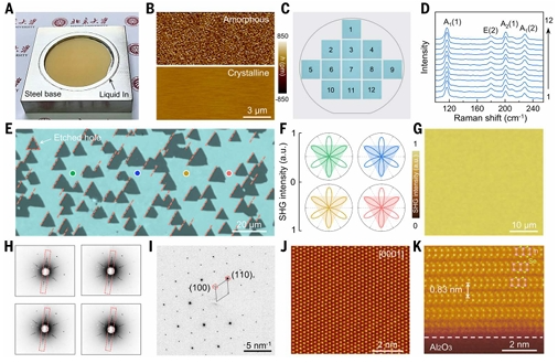 高均匀性:晶圆表面粗糙度由非晶态的415 pm降至37 pm,拉曼光谱及SHG成像证实全区域单晶结构。