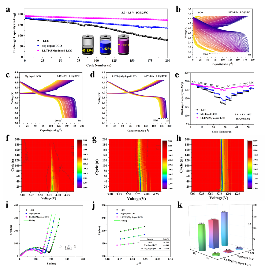 图2、(a)所有样品1 C电流密度的循环性能;(b)LCO、(c)Mg-doped LCO和(d)LLTP@Mg-doped LCO的充放电曲线;(e)所有样品的倍率性能;(f)LCO、(g)Mg-doped LCO 和(h)LLTP@Mg-doped LCO从第 1 周到第 200 周循环的 3D 微分电容曲线俯视图;电化学阻抗谱(EIS)结果:(i)奈奎斯特图,(j)所有样品在低频区Z′与ω-1/2的线性拟合,(k)所有样品的Rs和Rct值。