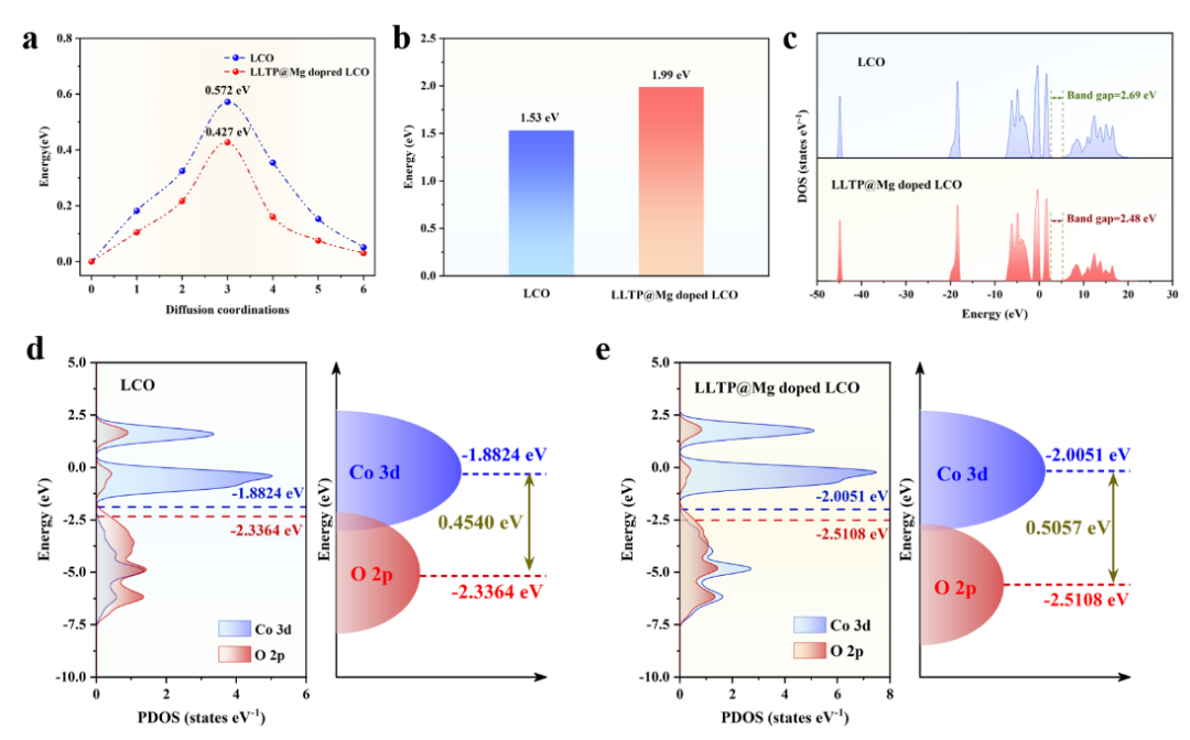 图4、LCO和LLTP@Mg-doped LCO的密度泛函理论(DFT)计算结果:(a)锂离子迁移能垒,(b)氧空位形成能,(c)态密度;(d)LCO 和(e)LLTP@Mg-doped LCO的Co 3d与O 2p能带中心之间的态密度及能隙图。