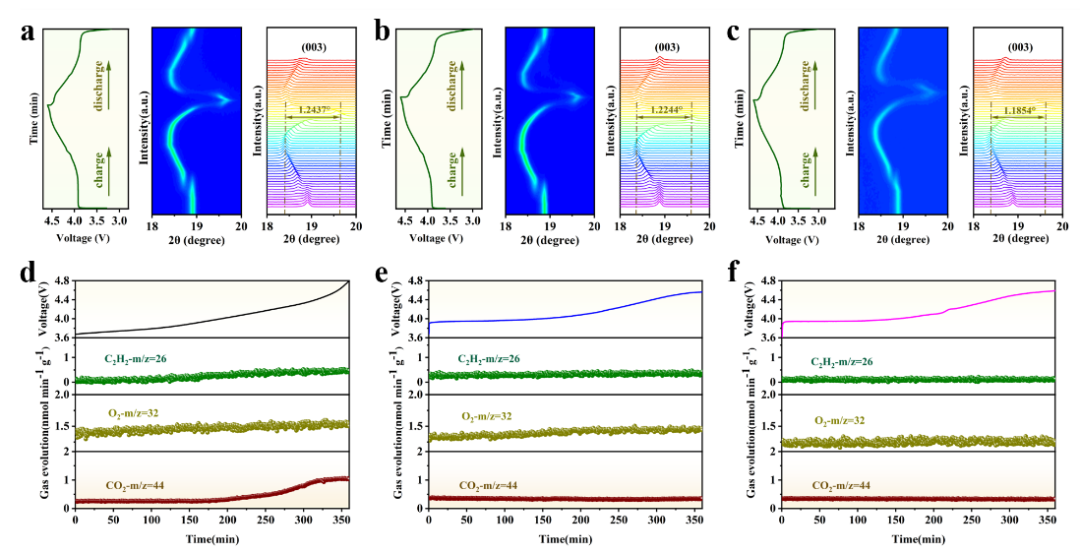 图3、(a)LCO、(b)Mg-doped LCO和(c)LLTP@Mg-doped LCO的原位 XRD 图谱中(003)特征峰及对应电压-时间曲线;(d)LCO、(e)Mg-doped LCO 和(f)LLTP@Mg-doped LCO在首次充电过程中DEMS测试结果。