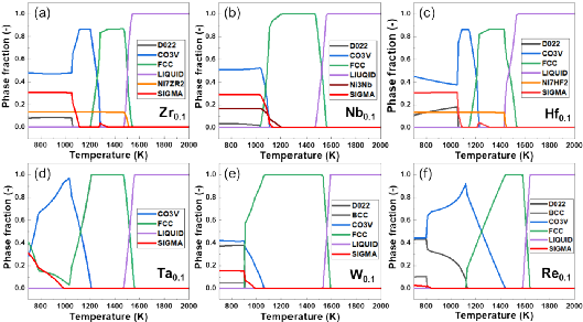 图2 X = (a) Zr, (b) Nb, (c) Hf, (d) Ta, (e) W, (f) Re时NiCoV0.9X0.1中熵合金的相图