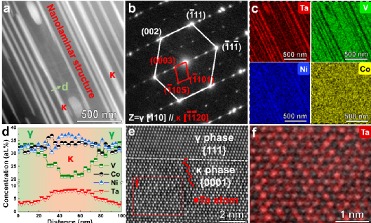 (1)利用CALPHAD和DFT计算,有效识别Ta元素并将其引入NiCoV中熵合金中形成κ片层。Ta固有的缓慢原子扩散速率成功地抑制了κ片层的增厚,导致NiCoV0.9Ta0.1中熵合金内形成超细、半共格的纳米片层结构。