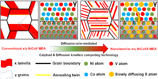 图1 扩散速率介导的半共格纳米层状NiCoVX中熵合金设计策略示意图