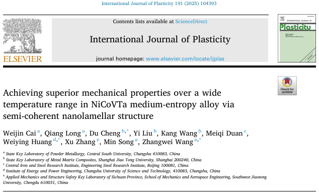 相关研究成果以“Achieving superior mechanical properties over a wide temperature range in NiCoVTa medium-entropy alloy via semi-coherent nanolamellar structure”发表在《International Journal of Plasticity》,论文链接:https://www.sciencedirect.com/science/article/pii/S0749641925001524