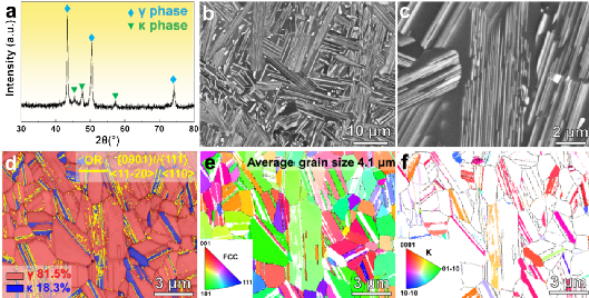 (4)显著的应变硬化行为和极限抗拉强度归因于κ相和位错之间复杂的相互作用。具体而言,初期位错塞积在κ相处显著提高了应变硬化速率,而随后的位错剪切和层错激活则缓解了应力集中,协同稳定了塑性变形。此外,变形引起的位错亚结构,包括9R相、纳米孪晶和位错缠结,在77 K至723 K的温度范围内对高水平的应变硬化起了重要作用。