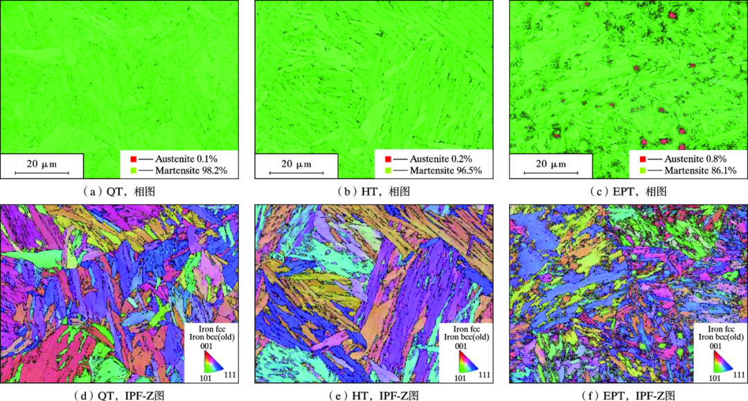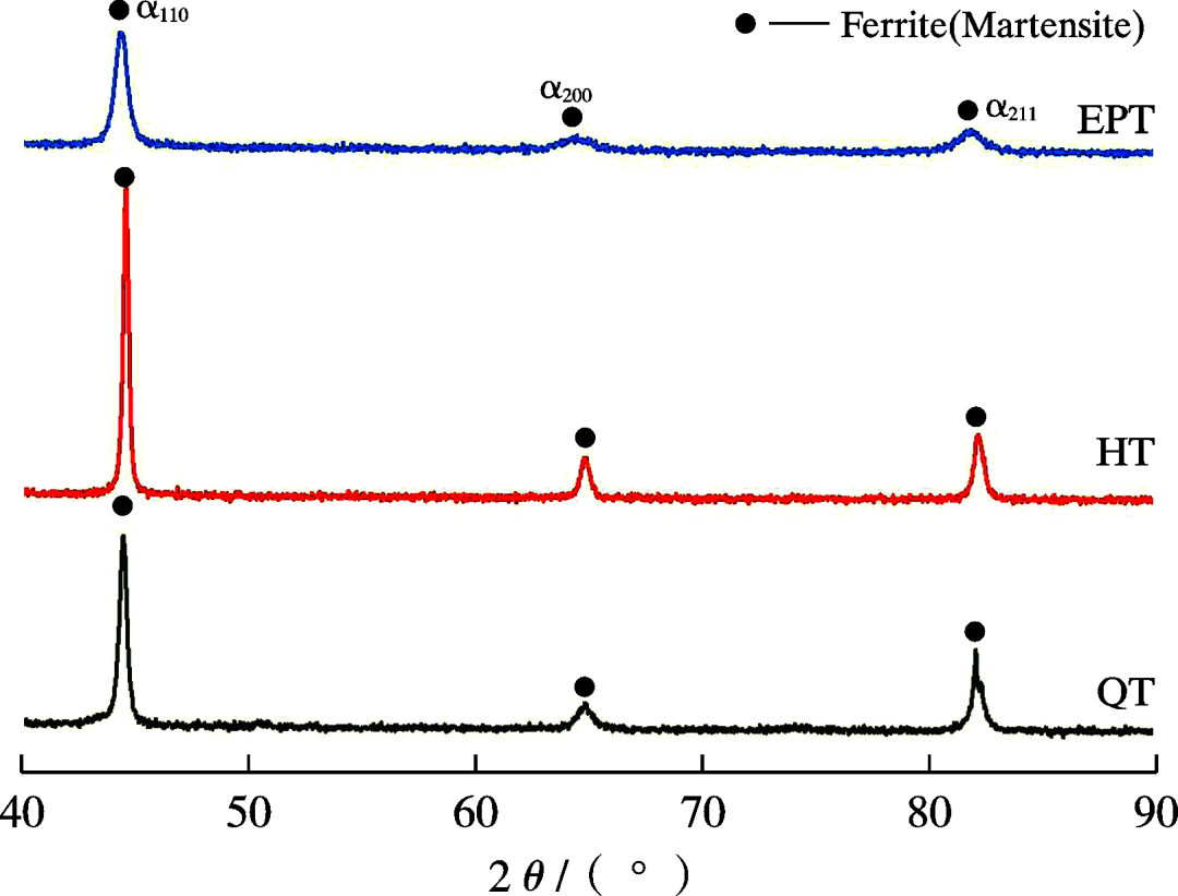 QT、HT和EPT试样的微观组织均以马氏体为主,HT处理试样的平均晶粒尺寸为149.31 μm2,QT处理试样的平均晶粒尺寸为62.49 μm2,EPT试样具有更加细小的平均晶粒尺寸22.6 μm2,这得益于脉冲电流的焦耳热效应和非热效应共同作用的效果。